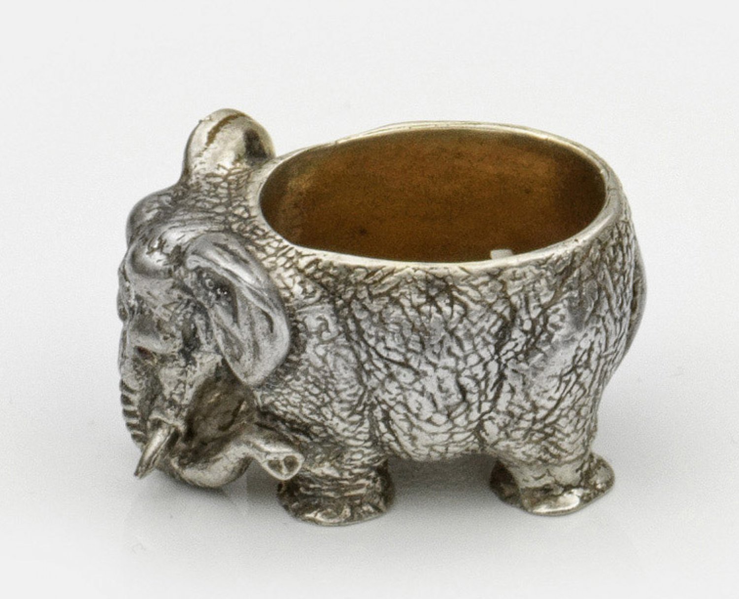 Miniatur-Elefant im Stil von Karl Fabergé. Kleines Gefäß in Gestalt eines vollplastischen fein reliefiert dargestellten Elefanten mit Stoßzähnen. Als Augen zwei Granatcabochons. Innen vergoldet. Gest. 84. Gew. ca. 115 g. 2 7 cm x 4 5 cm.