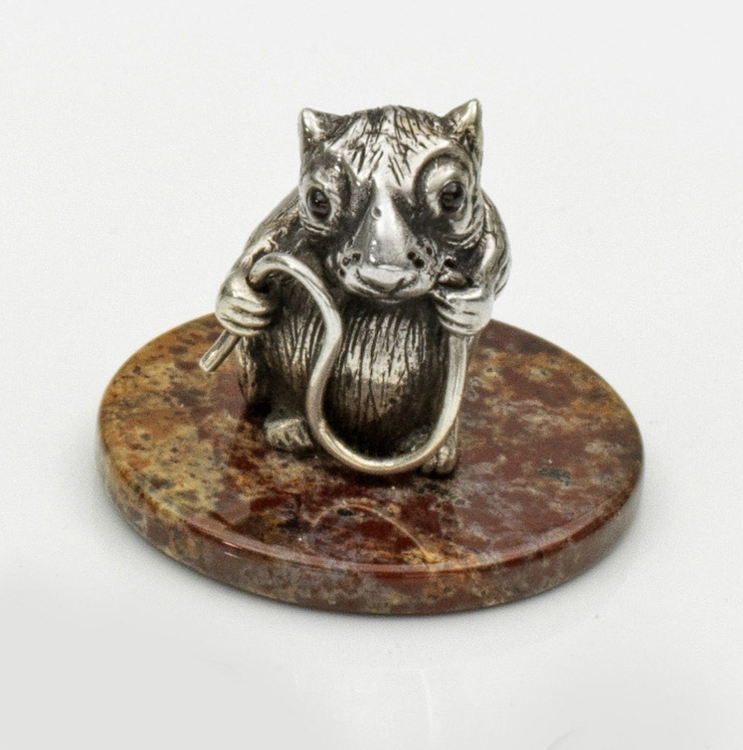 Miniatur-Hamster im Stil von Karl Fabergé. Silber. Auf einem polierten, rot- und ockerfarbenen Achatsockel eine naturalistische, vollplastisch gearbeitete Darstellung eines Hamsters, auf einem Halm aus Silberdraht kauend. Als Augen zwei kleine Rubincabochons. Mit fein gravierter Fellzeichnung. Undeutl. gest.; H. 3,8 cm.