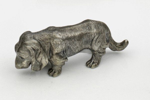 Miniatur-Langhaardackel im Stil von Karl Fabergé. Silber. Naturalistische Darstellung eines stehenden Langhaardackels. Als Augen zwei Granatcabochons. Gest. 84. Gew. ca. 88 g. H. 2 cm. L. 5 7 cm.