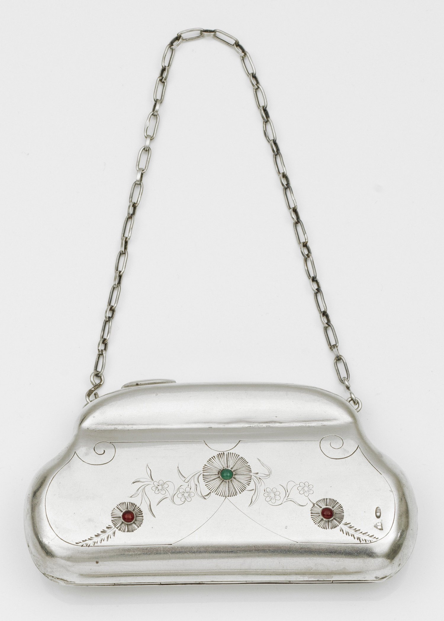 Kleine Abendhandtasche Silber. Passig geschweift mit scharniertem Deckel. Auf der Schauseite verziert mit fein ziseliertem Liniendekor und stilisierten Blattranken und Blüten. Besetzt mit einem grünen und zwei roten Schmucksteinen. Der Drücker mit blauem Cabochon besetzt. Zarte Gliederkette. Im Inneren Reste der Auskleidung. Gest. 88. 13 cm x 7 5 cm.