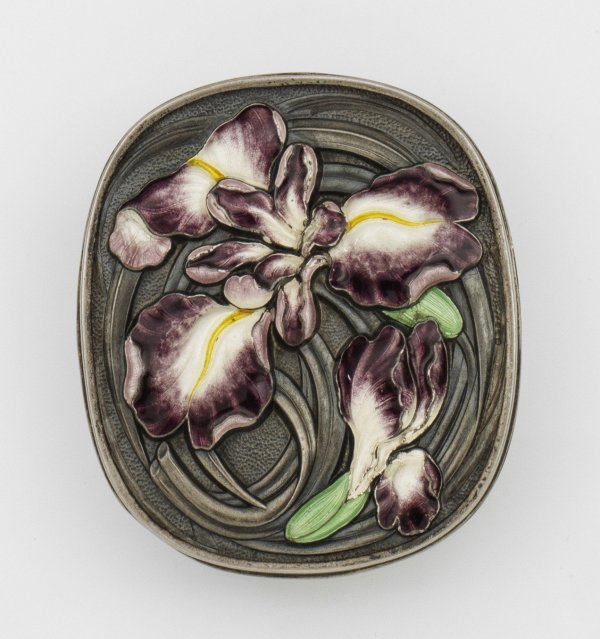 Florale Deckeldose Silber teilw. emailliert. Ovale Form. Gering vertiefter flacher Deckel mit reliefplastisch zart gestalteten lila- weiß- gelb- und hellgrünfarben emaillierten Irisblüten über punziertem Grund und in sich verschlungenen lanzettförmigen Blättern. Gest. 84. Gew. ca. 98 g. H. 2 4 cm. 7 7 cm x 6 7 cm.