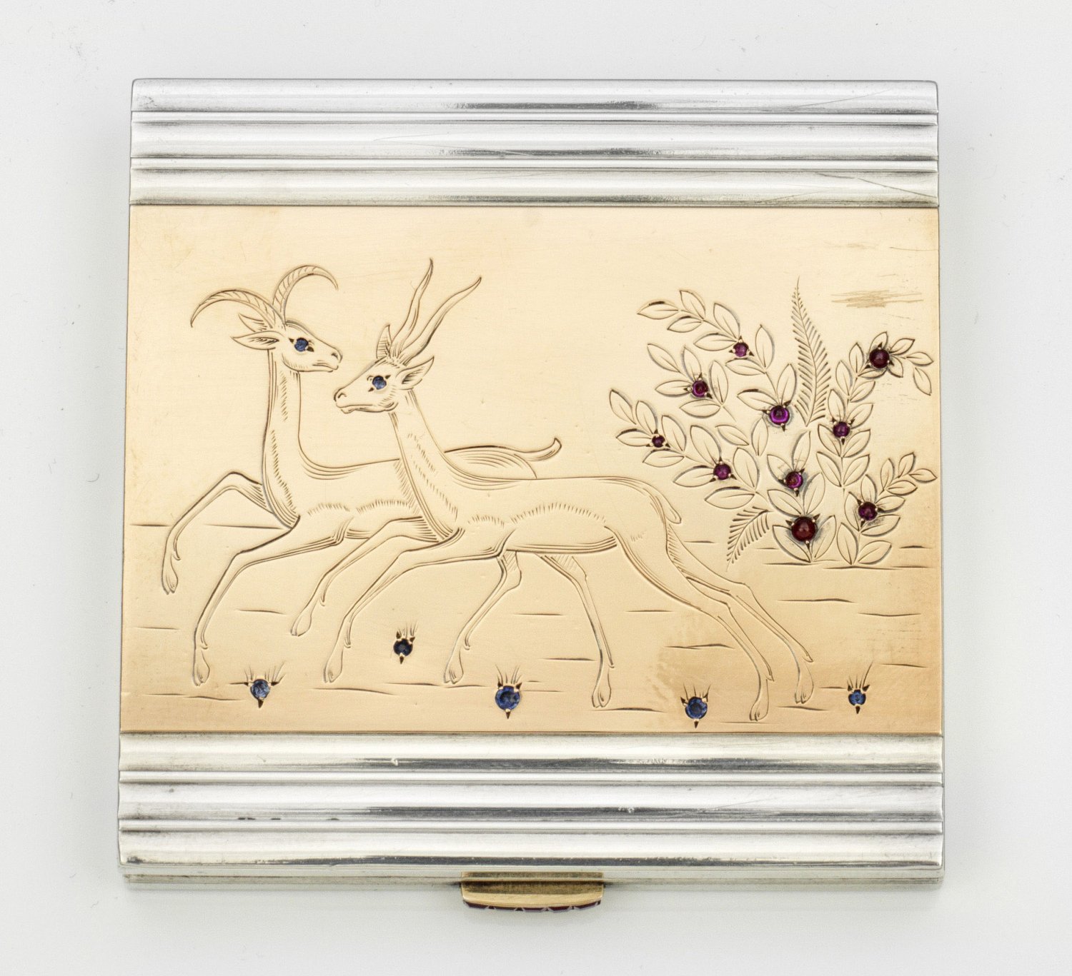 Art Déco-Schminketui Silber und Gold. Rechteckig mit flächendeckendem Profilliniendekor. Auf dem Deckel gravierte Darstellung zweier Springböcke in stilisierter Landschaft dekorativ besetzt mit 10 Rubincabochons und 7 Saphiren. Linearer Drücker besetzt mit 5 Rubinen. Im Innendeckel Spiegel. Minim. altersbedingte Gebrauchsspuren. Gest. Beschaumarke undeutl. Meistermarke. Gew. ca. 140 g. 7 5 cm x 7 5 cm.