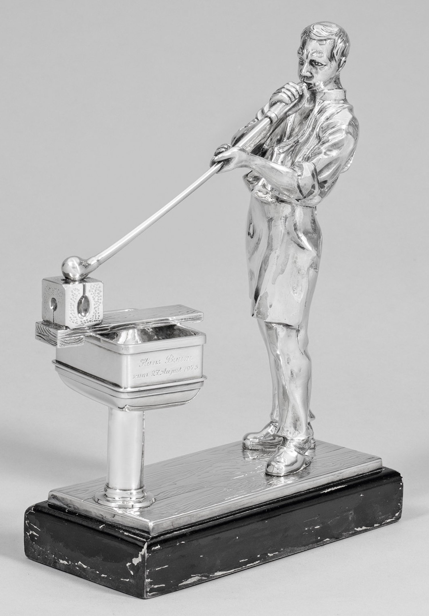 Skulptur eines Glasbläsers Silber. Ebonisierter Holzsockel. Auf flacher Plinthe in Form eines Holzbodens stehender Glasbläser in Arbeitskleidung beim Blasen einer Glasform. Die Pfeife auf einem Arbeitstisch mit Holzmodell gestützt, seitlich bez. "Hans Baum zum 27. August 1975 gewidmet von den Mitgliedern und Beiräten der Gruppe Heye". Gest. 925, Herstellerzeichen. H. 27,5 cm.