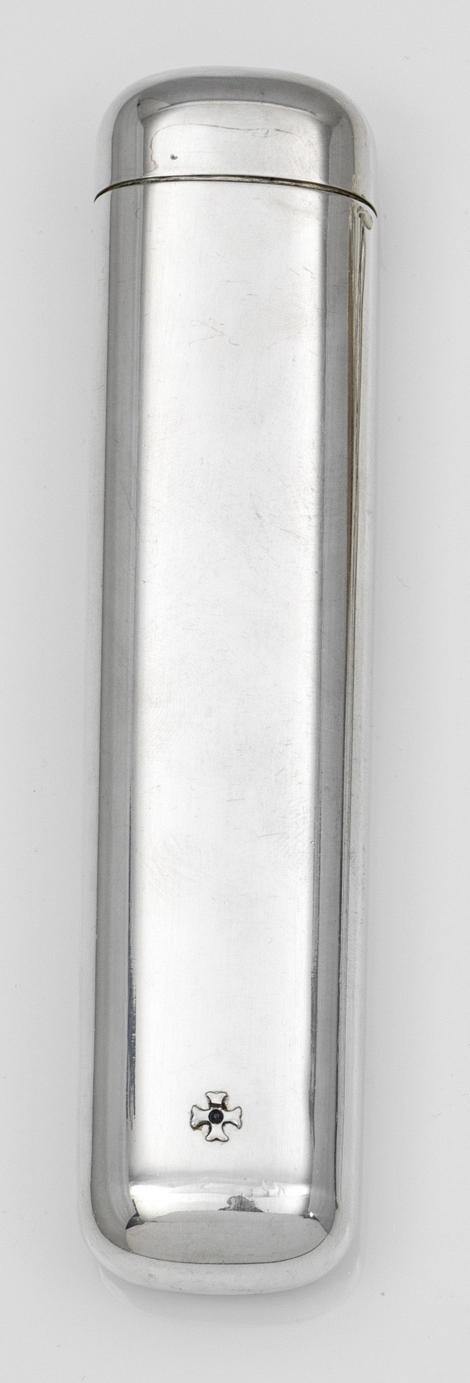 Zigarettenetui Silber. Rechteckig mit glatter Wandung und gerundeten Ecken. Appliziertes kleines Kreuz mit blauem Farbsteincabochon. Rückseitig untereinander gravierte Initialien "H.K.E.". Minim. Gebrauchsspuren. Gest. 925. Beschaumarke. 18 cm x 3,5 cm.