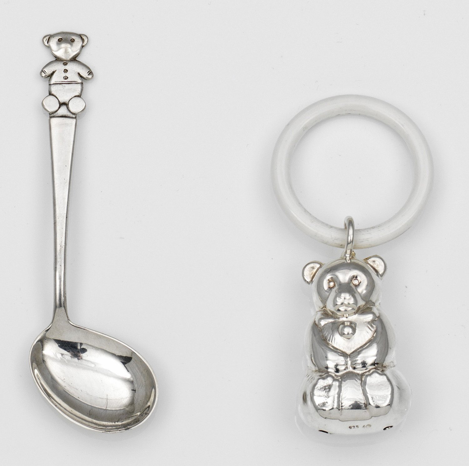Baby-Rassel und Löffel Silber. Vollplastische Rassel in Gestalt eines Bären mit Beißring aus Kunststoff sowie ein Löffel mit Griff in Form eines Bären. Gest. 800 925. Gew. zus. ca. 50 g.