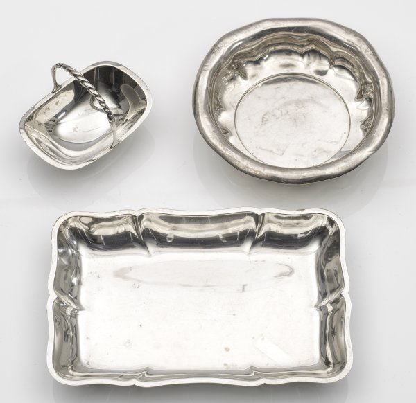 Konvolut Silber. 3-tlg.; Rechteckige und runde Schale mit geschweiftem Rand sowie kleiner Henkelkorb mit Besitzermonogramm, Dat.; Gest. 800, 835. Unterschiedliche Herstellerzeichen. Gew. zus. ca. 924 g.