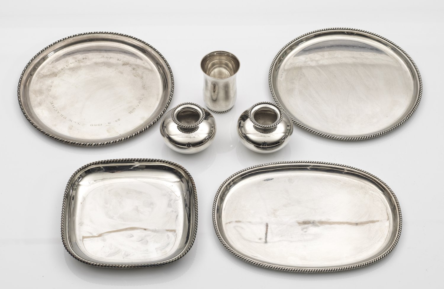 Konvolut Silber. 7-tlg.; 3 Tabletts, 2 Vasen, Anbietschale und Becher. Glatte Wandung mit ausschwingendem Rand, von einer Kordel umzogen. Teilw. mit Namensgravur. Gest. 835, 925. Teilw. Herstellerzeichen. Gew. zus. ca. 2090 g.