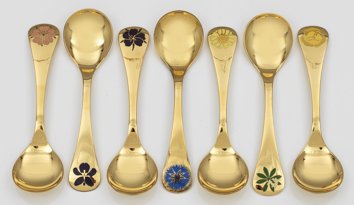 Sieben Georg Jensen-Jahreslöffel Vergoldet. Runde Laffe übergehend in sich erweiternden Griff. Auf dem Heft unterschiedliche polychrom emaillierte Blüten. Rückseitig dat. 1972 - 1978. Teilw. originalverpackt und mit Etuis. Gest. Sterling Herstellerzeichen. Gew. zus. ca. 320 g.