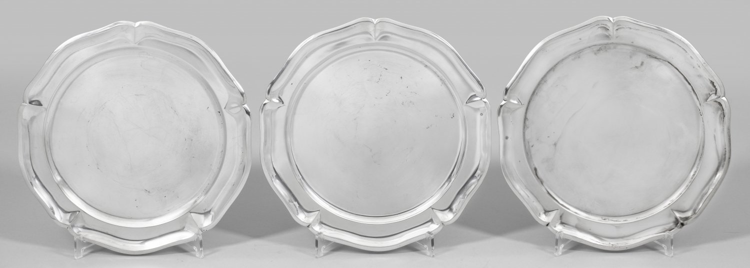 Drei Platzteller Silber. Gering gemuldeter glatter Spiegel übergehend in leicht ansteigende Fahne und blütenförmig geschweiften profilierten Rand. Gest. 925 Herstellerzeichen. Gew. zus. ca. 1728 g. D. 25 cm.