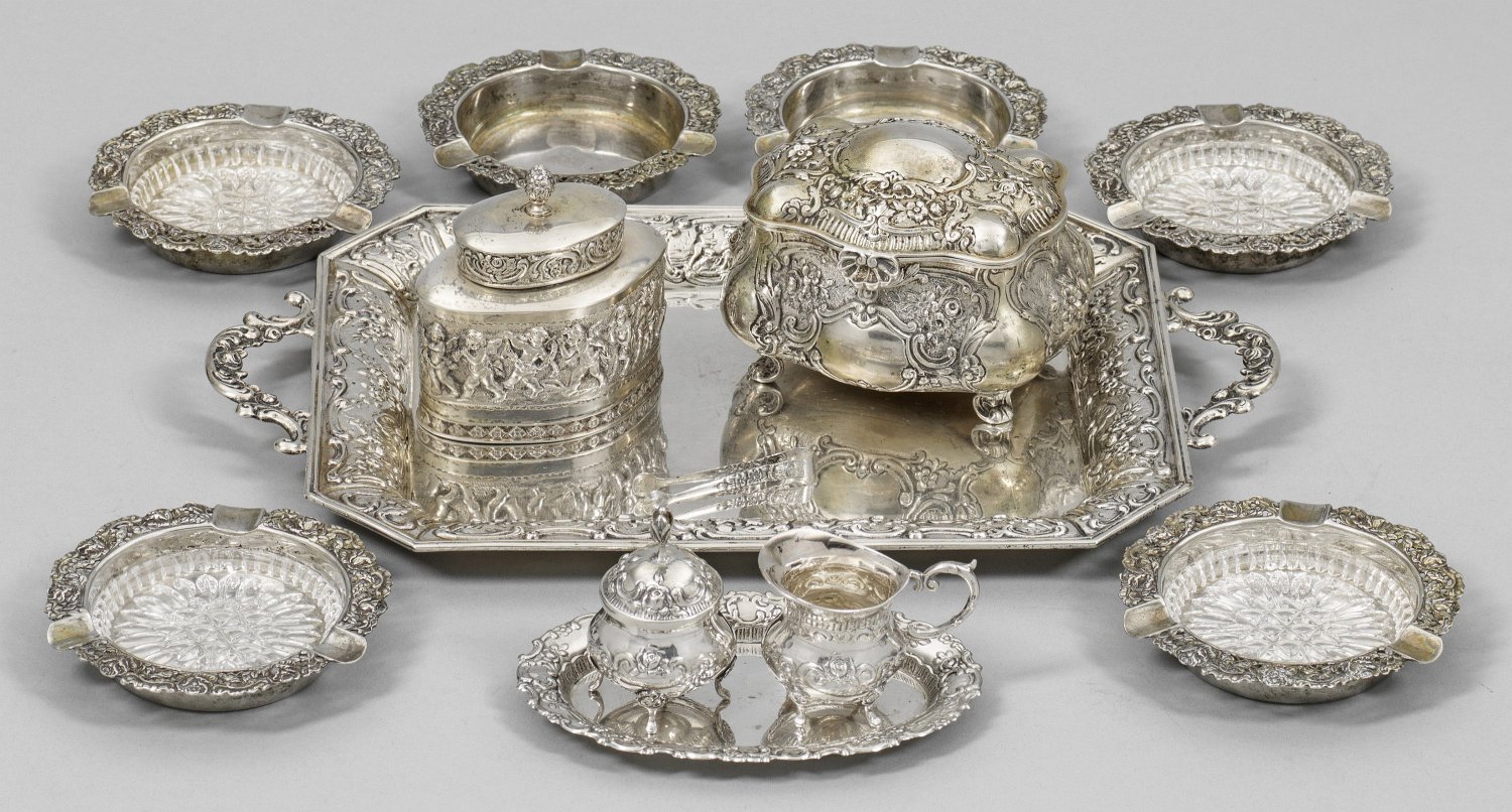 Neorokoko-Konvolut Silber. 13-tlg.; Sechs runde Aschenbecher mit Glaseinsatz, zwei Dosen, ein rechteckiges, kleines Henkeltablett sowie ein kleines ovales Tablett mit Zuckerdose, Sahnegießer und Zuckerzange. Korpus flächendeckend sehr dekorativ und hochreliefplastisch gestaltet in Form von Rocaillen, Voluten, Putten und Blüten. Teilw. fehlende Glaseinsätze. Gest. 800, 835, teilw. Herstellerzeichen. Gew. zus. ca. 1195 g.