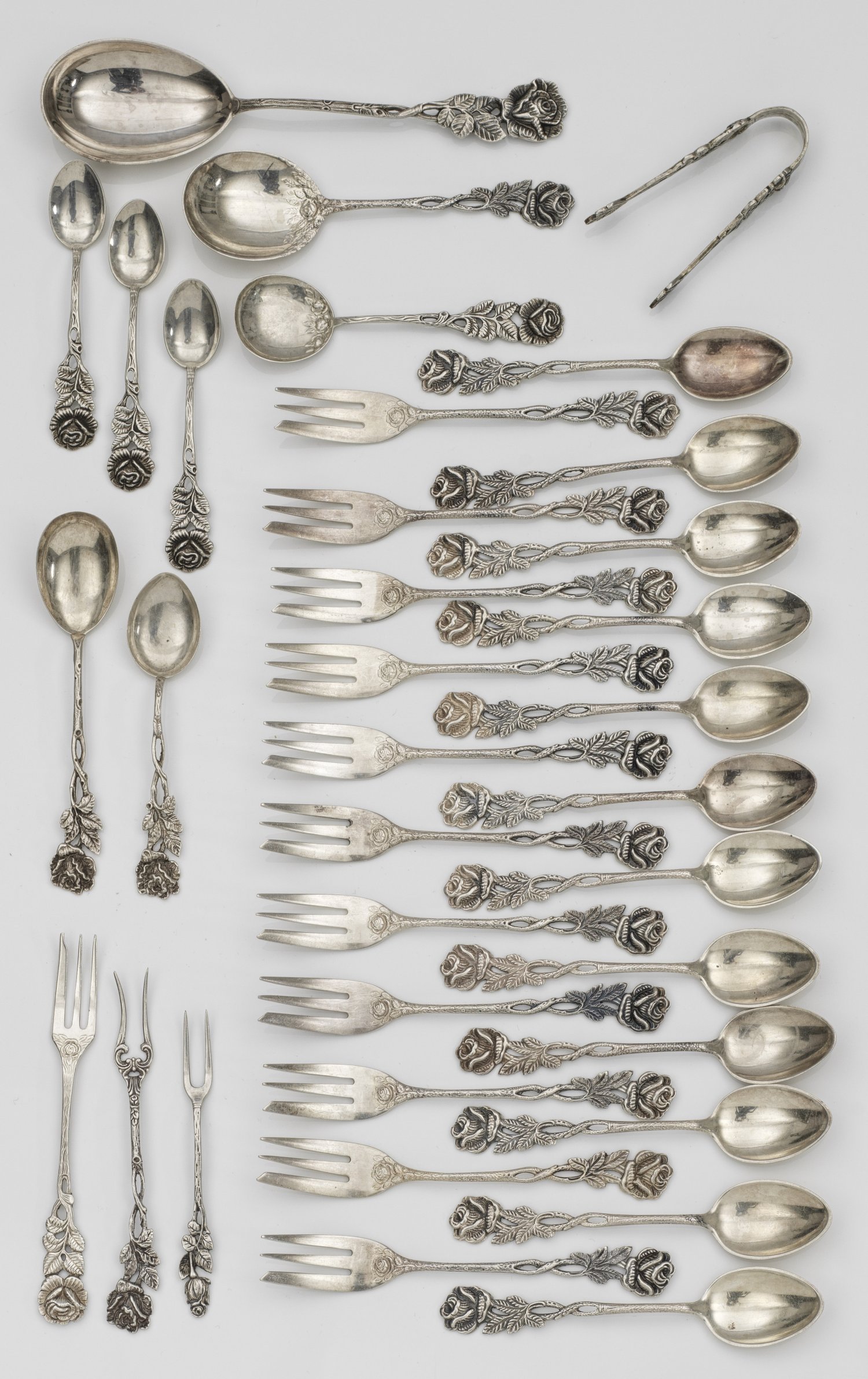 A German 35-piece silver mixed cutlery with roses. Standard mark 800.