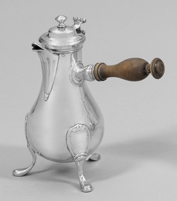 Kleine Mokkakanne Silber. Über drei hochgezogenen, stilisierten Füßen sich bauchig erweiternder Korpus mit schlankem Hals. Leicht aufgewölbter, in einen Balusterknauf endender Scharnierdeckel. Der Rand mit stilisiertem Palmettenfries verziert. Mittig angesetzter Ausguss und seitlicher Holzgriff. Gest.; Gew. ca. 210 g. H. 14 cm.