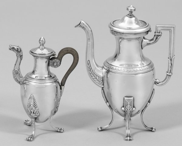 Zwei kleine Empire-Mokkakannen Silber bzw. plated. Über drei stilisierten Tatzenfüßen ovoider Korpus mit schlankem Hals und tief angesetztem Röhrenausguss, u. a. mit Tülle in Form eines Pferdekopfes und Ohrenhenkel aus ebonisiertem Holz. Teilw. gest.; Beschaumarke, Meistermarke. Altersgemäße Gebrauchsspuren. H. 14,5 cm - 19 cm.