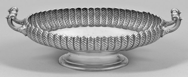Henkelschale Silber. Über ovalem profiliertem Stand gemuldeter glatter Korpus. Wellenförmiger von plastischem Zopfband umzogener Rand. Zwei von Voluten gefasste Griffe. Gest. 800 Herstellerzeichen Juweliermarke Hessenberg. Gew. 340 g. H. 9 5 cm. 30 cm x 18 cm.