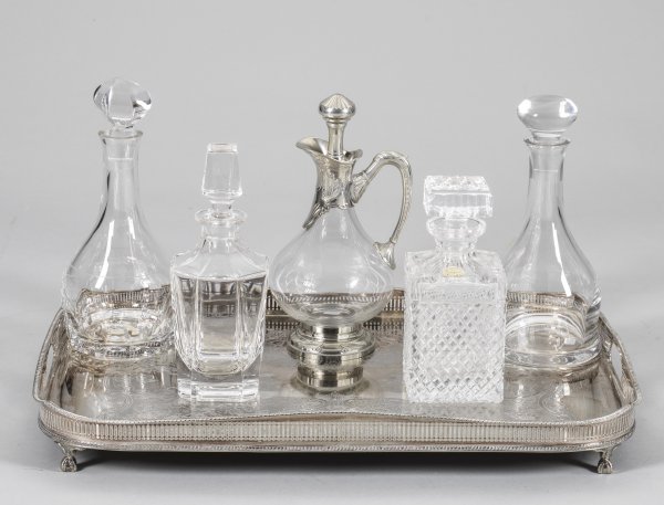 Galerietablett mit Karaffen Plated bzw. Glas. Fünf Glaskaraffen mit Stöpseln teilw. mit Metallmontierung und facettiert geschliffen. Rechteckiges Tablett mit abgerundeten Ecken über vier plastischen Vogelklauen. Hoher Rand umlaufend netzgitterartig durchbrochen gearbeitet. An den Schmalseiten kleine Griffmulden. Spiegel mit Blättern Blüten und Voluten verziert. Tablettmaße 60 5 cm x 39 5 cm. Karaffen-H. 22 5 cm - 30 5 cm.