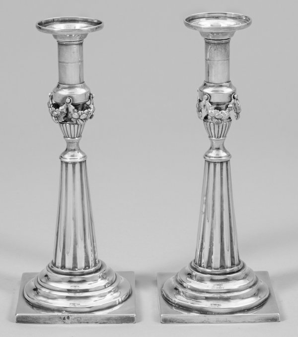 Paar Tafelleuchter im Louis XVI-Stil Silber. Über quadratischer Plinthe getreppt ansteigender Rundfuß. Mittig sich stark konisch verjüngender, kannelierter Schaft, in godronierter Vasenform endend. Umlaufend anhängende, plastisch gearbeitete Fruchtfestons. Zylindrische Tülle mit breiter, herausnehmbarer Traufschale und kurzem Rand. Teilw. rest.; Gest.; Gew. zus. ca. 940 g. H. 27,5 cm.