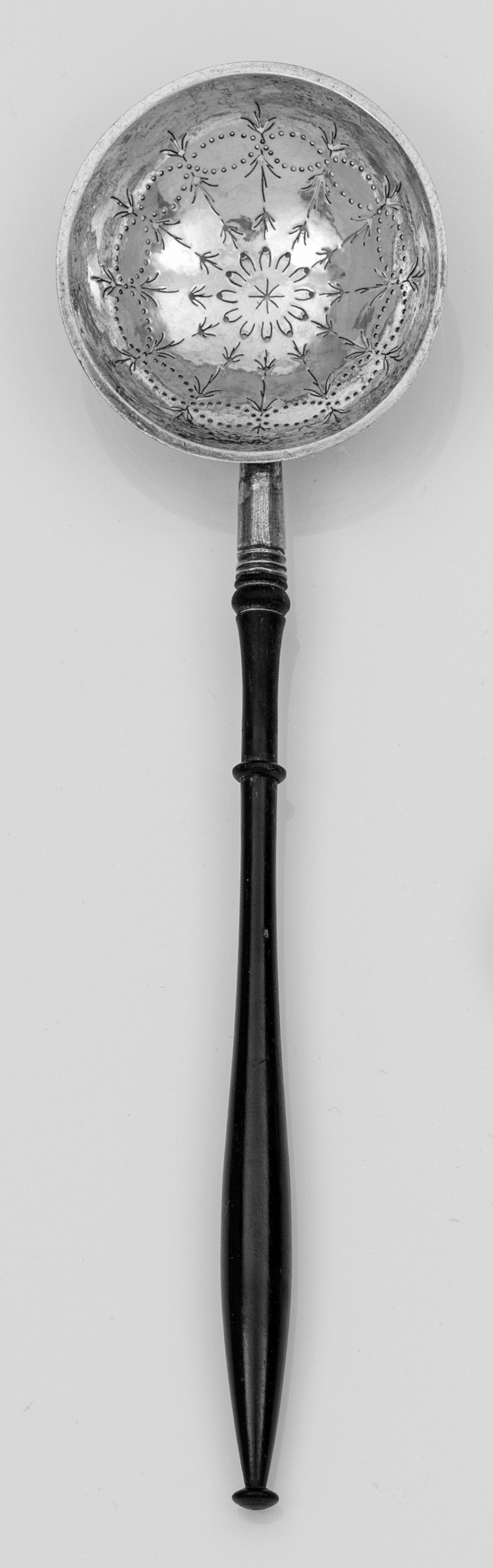 Biedermeier Zuckerstreulöffel Silber. Runde, durchbrochen gearbeitete und gemuldete Laffe, übergehend in schmalen, ebonisierten Balusterknauf. Gest.; Beschauzeichen, Meistermarke "PP". L. 23 cm.