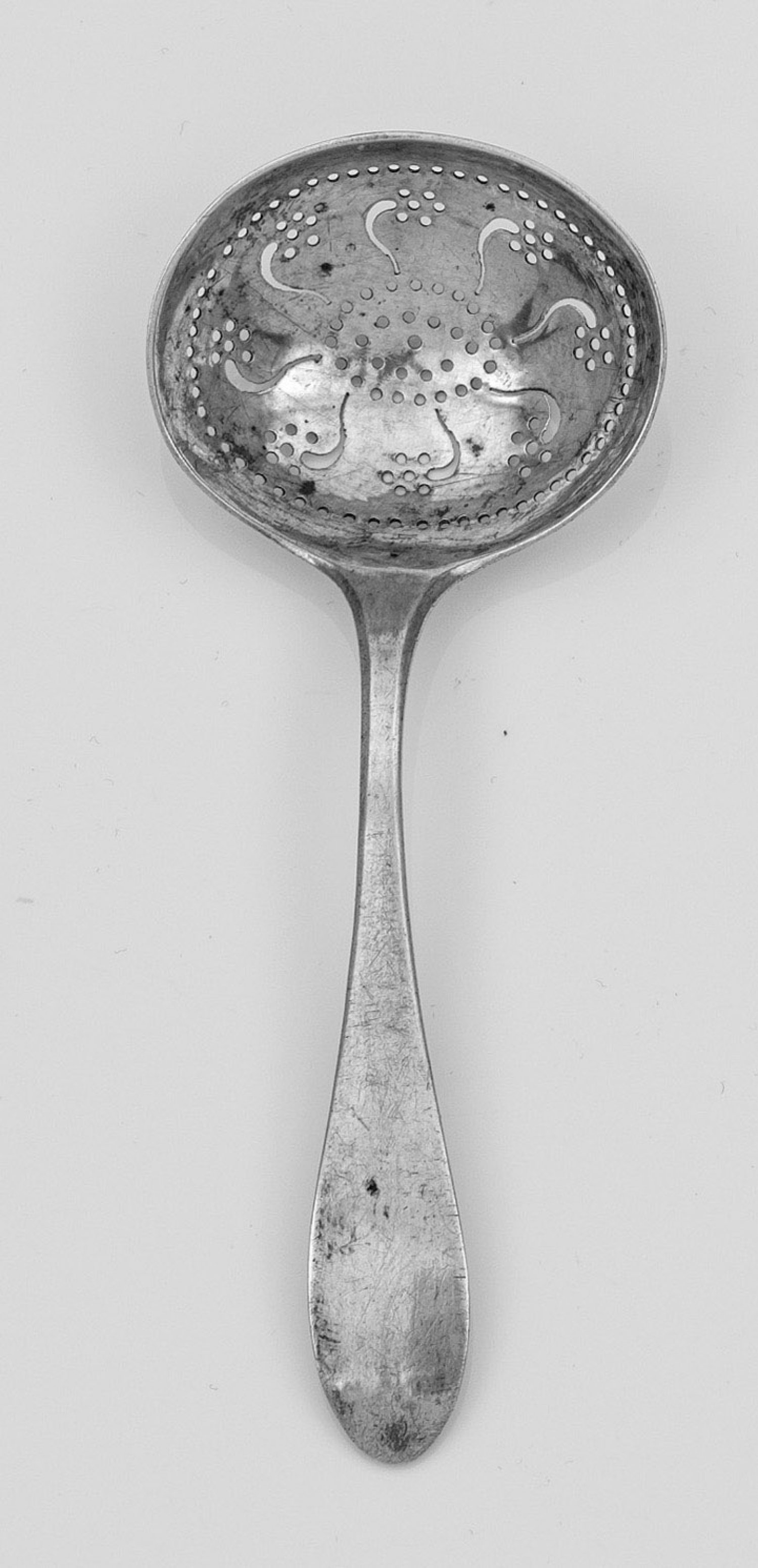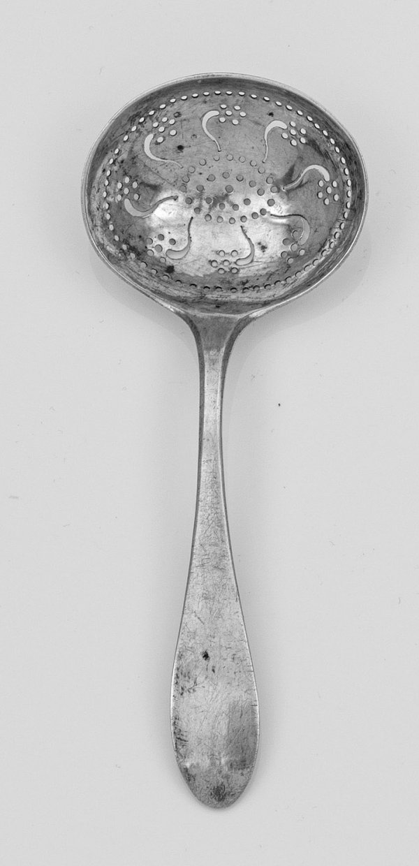 Kleiner Biedermeier-Streulöffel Silber. Durchbrochen gearbeitete, ovale Laffe, übergehend in sich erweiternden, flachen Griff. Gest.; undeutliches Beschauzeichen, Meistermarke "CH". Gew. ca. 13 g. L. 11 cm.