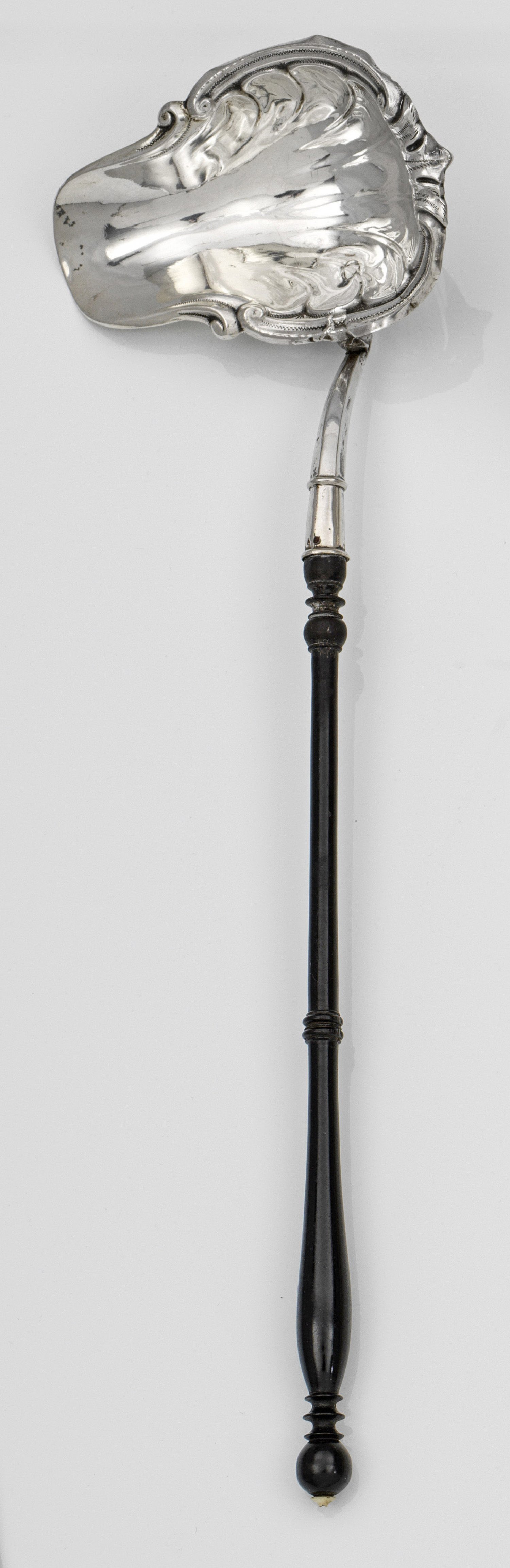 Biedermeier-Punschkelle Silber. Ovale Laffe in Form einer Muschel mit seitlich zum Ausguss gezogenem, godroniertem und fein ziseliertem Lippenrand. Langer Balustergriff aus ebonisiertem Holz. Minim. besch.; L. 38 cm.