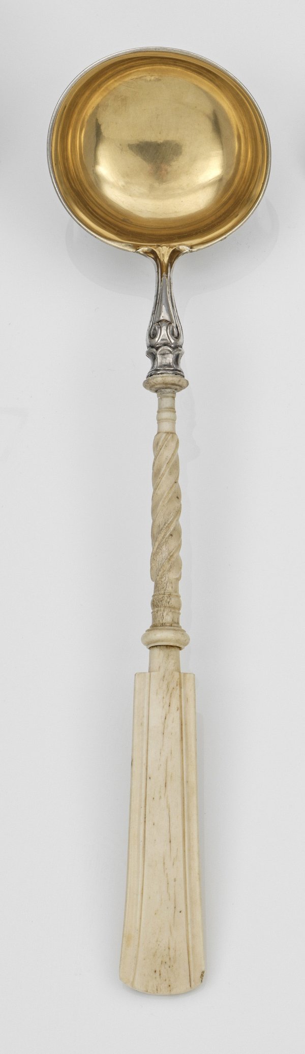 Biedermeier-Schöpfkelle Silber und Knochen. Runde Kelle innen vergoldet mit godroniert geschnitztem Griff. Minim. altersgemäße Gebrauchsspuren. Gest. 13 Lot undeutliche Meistermarke. L. 53 cm.