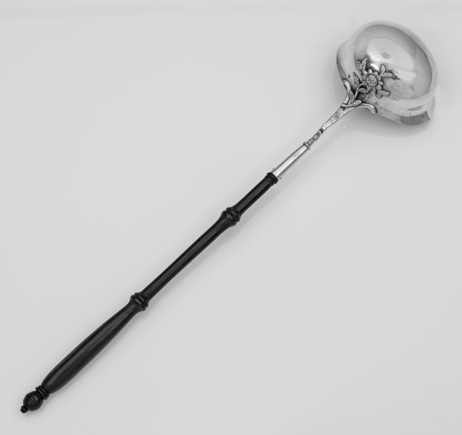 Rokoko-Suppenkelle Silber. Ovale, tief gemuldete und gering gebauchte Kelle mit seitlich zum Ausguss gezogenem Rand. Auf der Kellenunterseite eine applizierte, reliefplastisch gearbeitete und fein ziselierte Blume, übergehend in langen, ebonisierten Balustergriff. Innen vergoldet. Gest.; Beschaumarke, Jahresbuchstabe Q, Meister Johann Balthasar Meyer (wird Meister 1771). L. 45 cm.