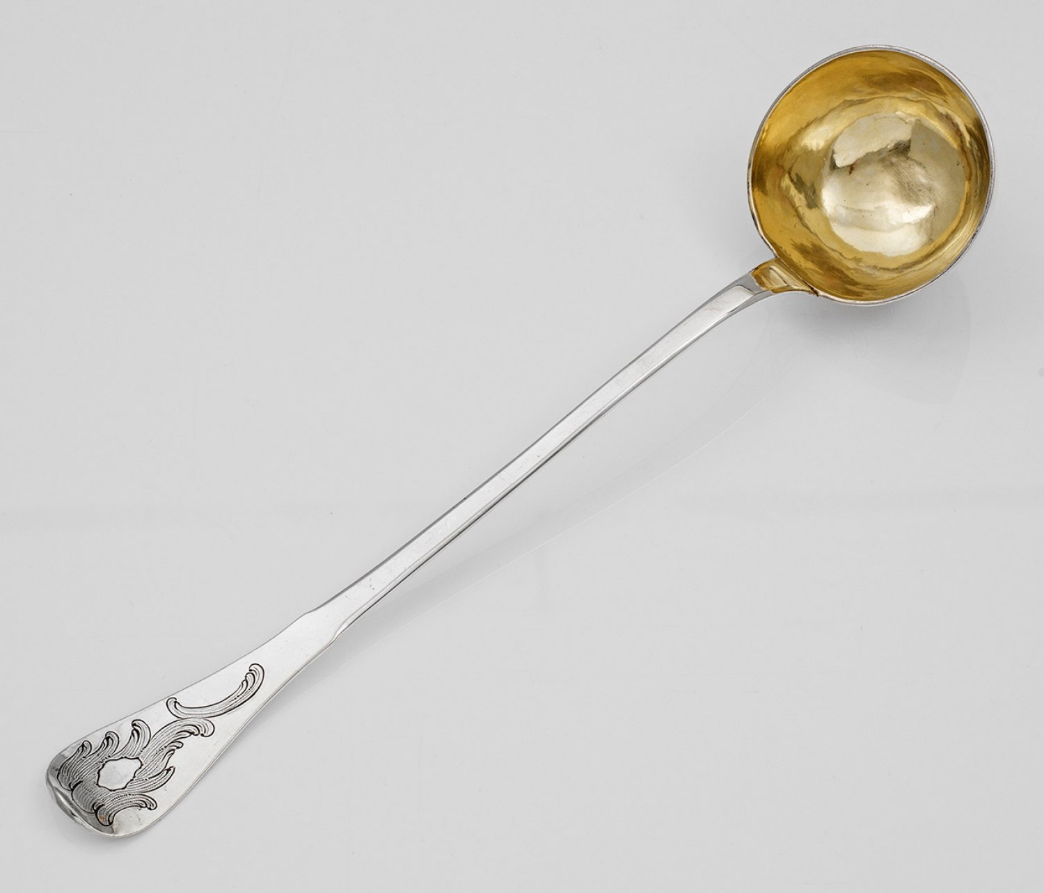 Rokoko-Suppenkelle Silber teilvergoldet. Halbrunde Kelle übergehend in flachen Griff. Auf der Kellenrückseite und dem gerundeten Heft gravierter Rocaillendekor. Gest. Stadtmarke Meister Johann Christian Wrigge (wird Meister 1762). Gew. ca. 200 g. L. 39 cm.