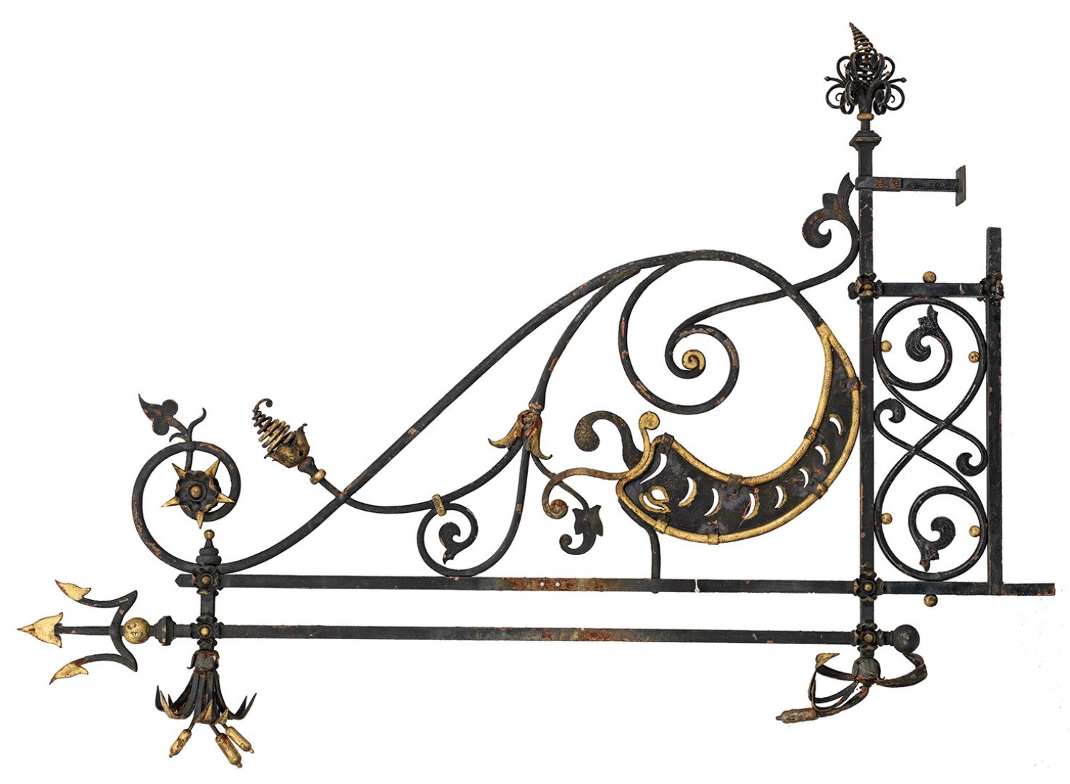 Belle Époque-Außenträger für ein Ladenschild Schmiedeeisen dunkel lackiert und teilw. vergoldet. Aus vierkantigen Stäben rechtwinklig verstrebtes Gestell mit reicher Ornamentik aus großen eingerollten Blattvoluten Rosetten sowie dreizackähnlichen und spiralförmigen Formelementen. Teilw. besch. mit Altersspuren. H. 202 cm. Max. B. 136 cm.