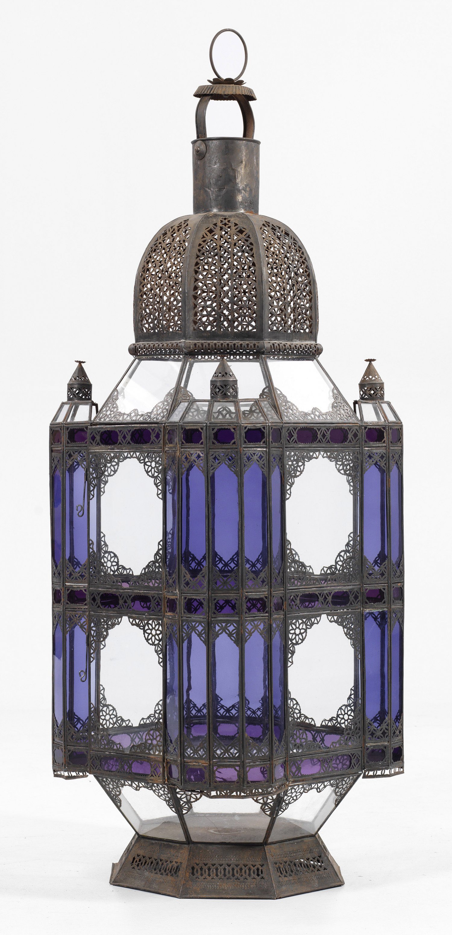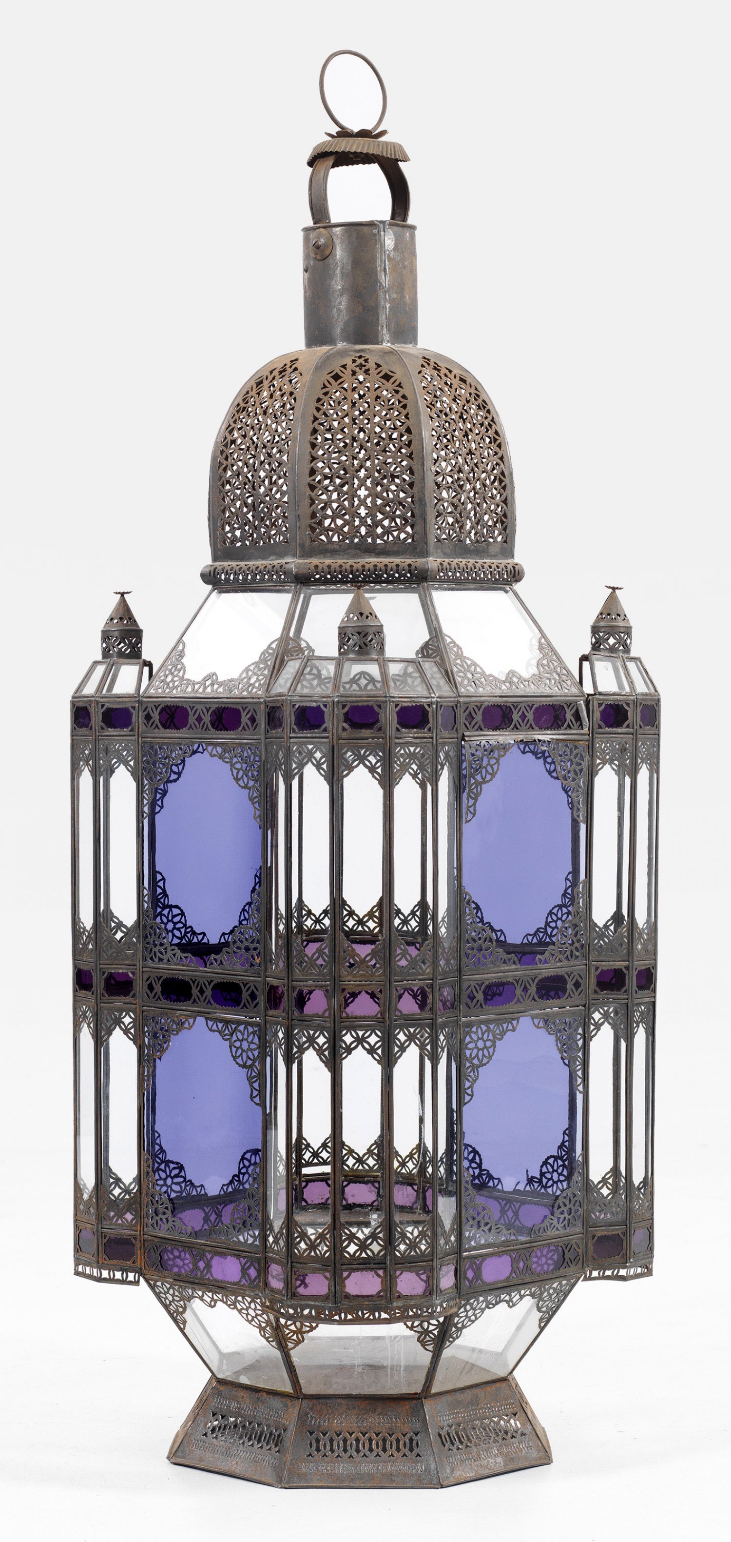 Paar große imposante marokkanische Laternen Dunkel patiniertes Metall mit farblosen und violetten Glaseinsätzen. Balusterförmiger umlaufend gekanteter Korpus aus schmalen Stegen und ornamental durchbrochen gearbeitetem Gitterwerk mit Erkerarchitektur als Einstellnischen für Kerzen sowie kuppelförmiger oberer Abschluss. H. 160 cm. 53 cm x 53 cm.