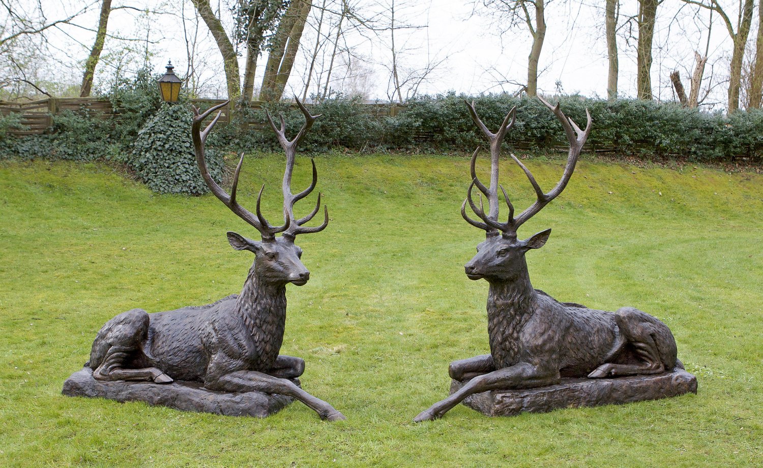 Bronze, dunkelbraun patiniert. Vollplastische, naturgetreue, detailreiche Darstellungen zweier liegender Hirsche mit großen Geweihen. Posthume, zeitgenössische Güsse (Ende 20./Anfang 21. Jh.) nach den berühmten Hirschfiguren, die der Bildhauer 1882 ursprünglich für das George-Washington-Nationaldenkmal in Philadelphia (USA) modellierte (Güsse ab 1885, Aufstellung 1897). 1898-1900 entstanden Zweitgüsse, die 1900/1901 ursprünglich am Floraplatz in Berlin aufgestellt, im Zweiten Weltkrieg und in der Nachkriegszeit beschädigt und 1979 im Rosengarten im Großen Tiergarten in Berlin neu aufgestellt wurden. H. ca. 188 cm; L. ca. 190 cm.