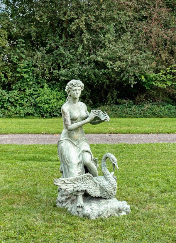 Große Parkbrunnenfigur mit Leda und dem Schwan Bronze in hellen graugrünlichen Tönen patiniert. Von der griechischen Mythologie inspirierte Figurengruppe. Auf einer unregelmäßigen Plinthe stehende Leda als Halbakt mit einem Tritonshorn in den Händen. Vor ihr der in einen Schwan verwandelte Zeus mit abwehrend ausgebreiteten Flügeln. H. ca. 143 cm.
