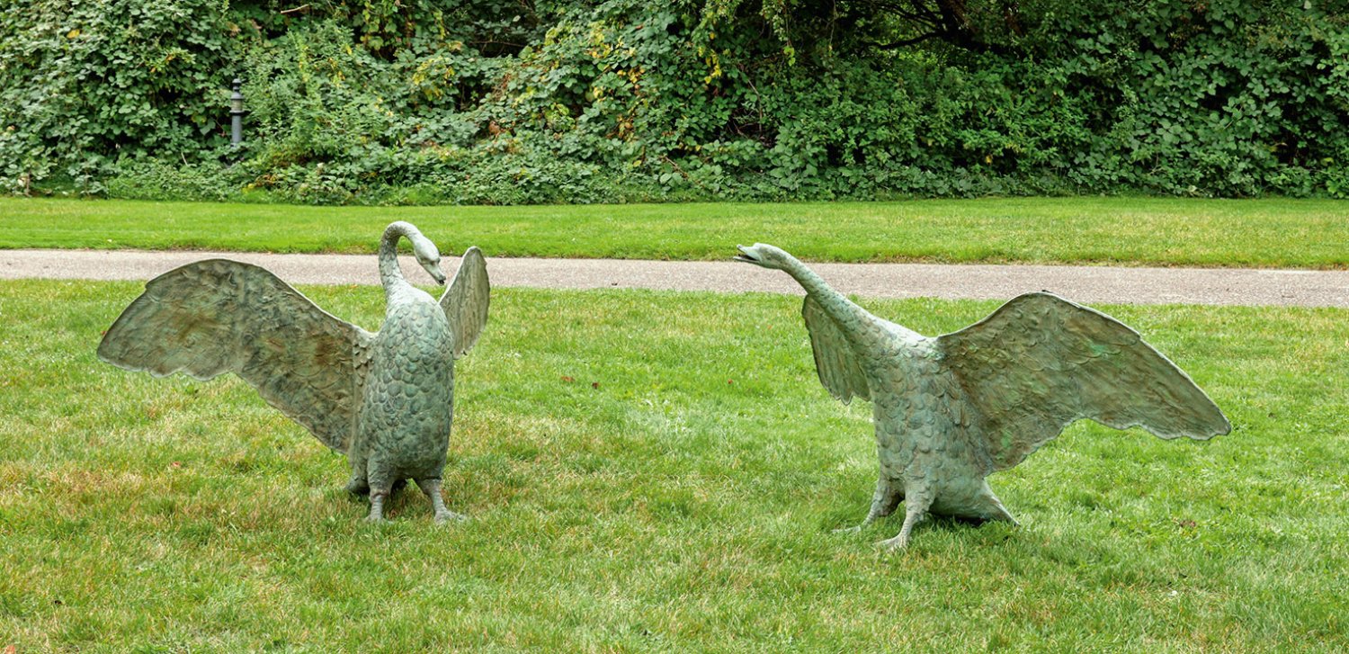 Gegenstücke. Bronze, in hellen, graugrünlichen Tönen patiniert. Vollplastische, lebensgroße, naturgetreue, lebendige Darstellungen zweier Schwäne mit unterschiedlich ausgebreiteten Flügeln und erhobenen Köpfen. Detailreich modellierte Federzeichnung. H. ca. 95 cm; B. ca. 155 cm-205 cm.