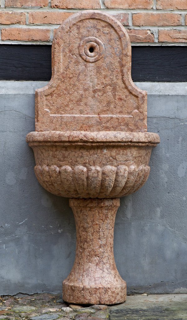Barock-Wandbrunnen 3-tlg.; Rotbraun und roséfarben gemaserter, sog. "Rosso Verona"-Marmor. Balusterförmiger Schaft als Träger für kräftig godroniertes Bassin mit gewulstetem Lippenrand. Oberhalb korrespondierendes Wandschild mit profilierter Rahmung sowie Aussparung für Wasserspeier. Ges.-H. 141 cm.
