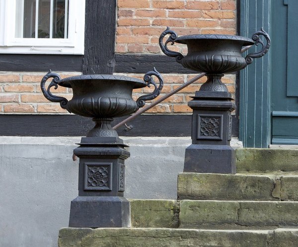 Paar Gartenvasen auf Postamenten Gusseisen geschwärzt. Balusterförmiger gedrückter Korpus mit umlaufendem Zungenfries weit ausschwingendem Lippenrand sowie volutenförmigen Henkeln aus Blattwerk. Unterhalb hoher profilierter Podestsockel mit reliefierten Rosettenmotiven. Ges.-H. 108 cm.