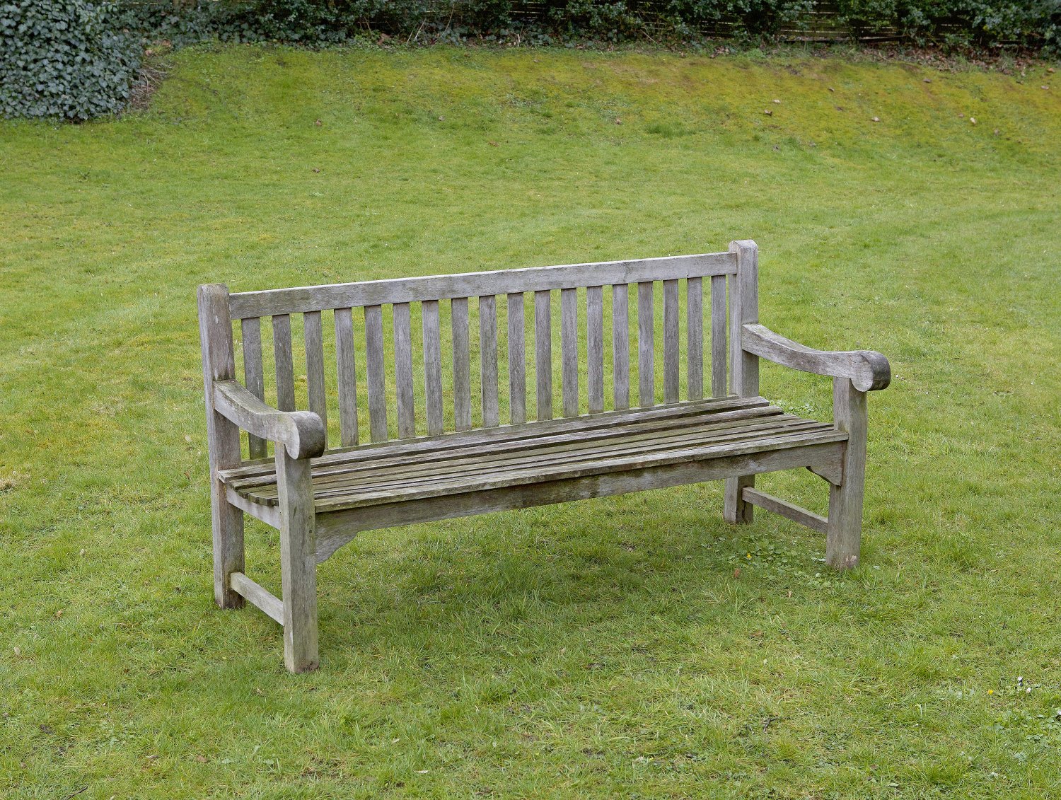 Gartenbank Holz mit witterungsbedingter Alterspatina. Gerade Zarge auf pfostenförmigen Beinen durch gekantete Stege verbunden. Leicht geschweifte Armlehnen sowie gerade Rückenlehne mit senkrechten Streben. H. 95 cm. 180 cm x 68 cm. Sitz-H. 45 cm.
