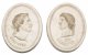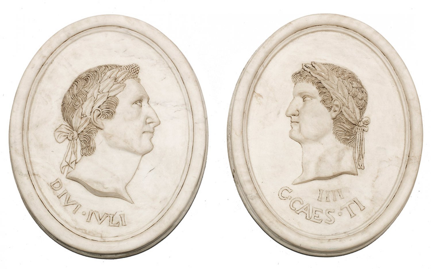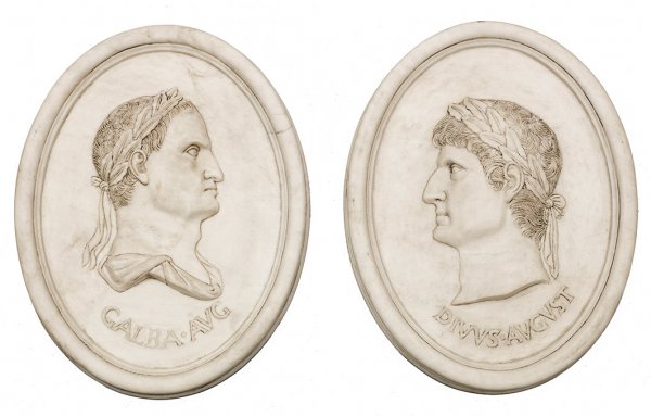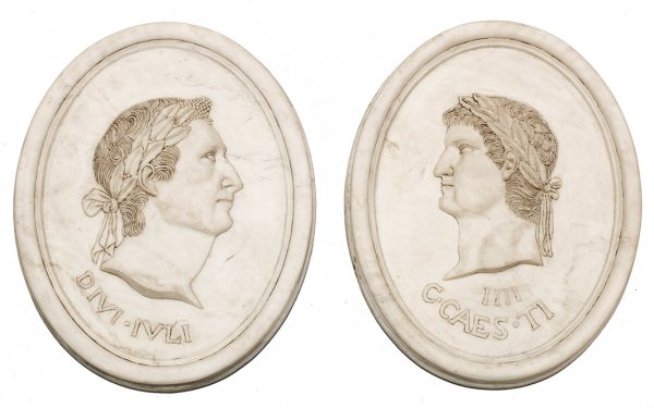 Weißer Marmor. Antikisierende Reliefbildnisse mit Lorbeerkränzen nach Vorlage altrömischer Münzen der Kaiser Augustus, Julius Cäsar, Tiberius und Galba. 44,5 cm x 35 cm, im Oval.