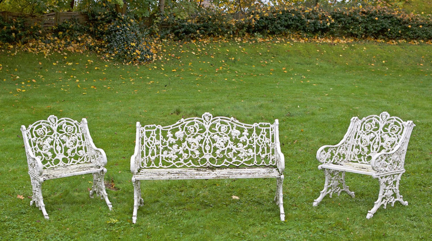 Garnitur Gartenmöbel 3-tlg.; Bank und zwei Armlehnsessel. Metallguss und Holz, weiß lackiert. Durchbrochen gearbeitete Seitenwangen aus Astwerk und üppigen, eingerollten, gegeneinander gestellten Volutenmotiven sowie korrespondierende, geschweift ansteigende Rückenlehne. Sitzfläche aus gekanteten Stäben. Altersspuren. Bank-H. 85 cm. 127 cm x 54 cm. Sessel-H. 83 cm. 61 cm x 54 cm. Sitz-H. 38 cm.