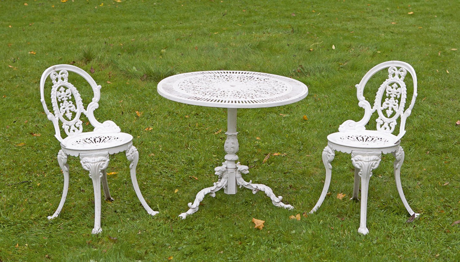 Garnitur Gartenmöbel 3-tlg.; Tisch und zwei Stühle. Metall, weiß lackiert. Gegliederter Balusterschaft auf blattreliefierten, geschwungenen Beinen als Träger für runde, durchbrochen gearbeitete Deckplatte. Stühle aus konkav eingezogenen Beinen, rosettenförmiger Sitzfläche und gewölbter Rückenlehne. Tisch-H. 63 cm. D. 77 cm. Sitz-H. 43 cm.