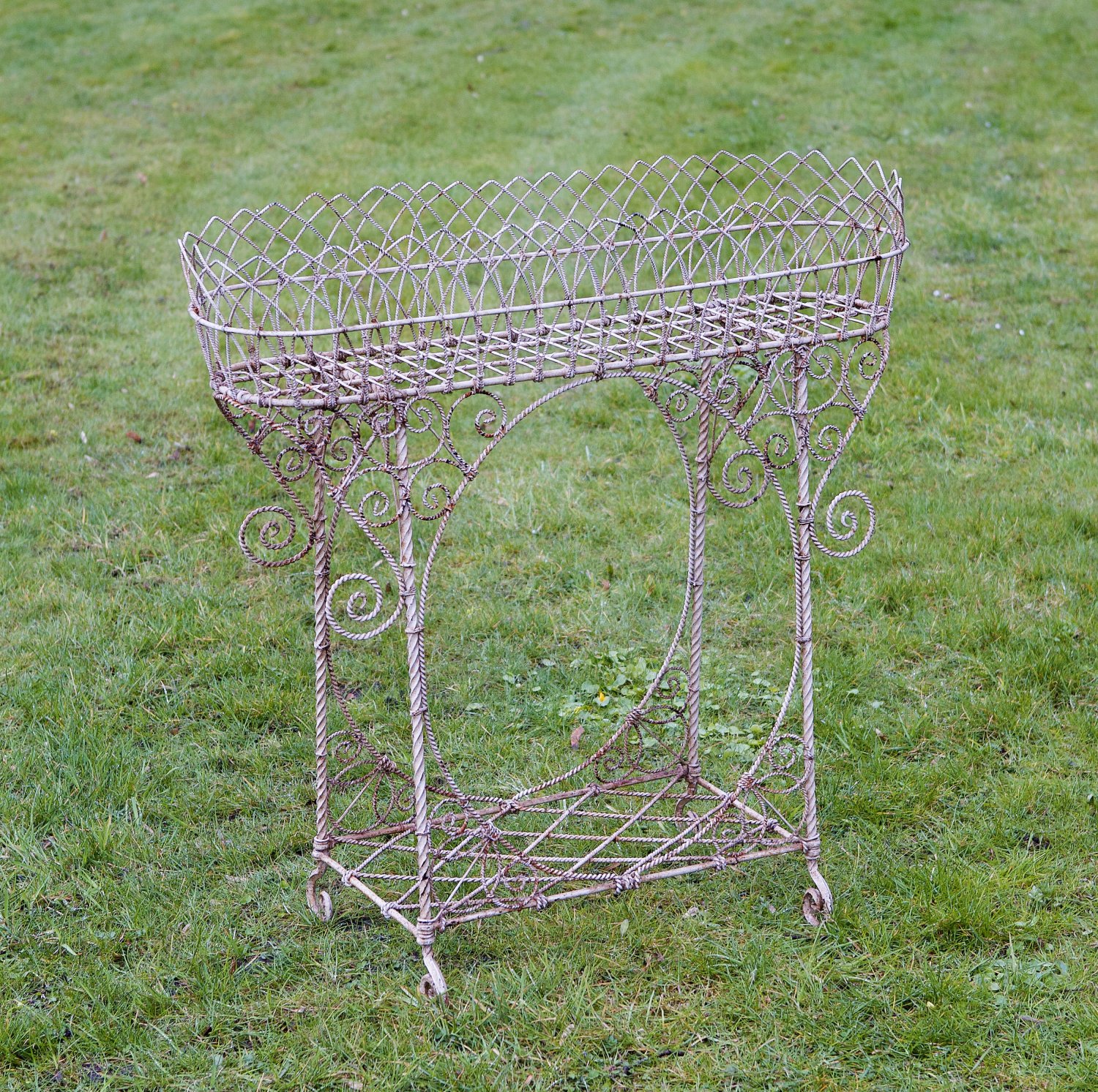 Belle Epoque-Blumenbank Metall cremefarben lackiert. Offen gestaltetes Gestell aus gedrehten volutenförmig eingerollten und ornamental angelegten Rundstäben als Träger für korbähnliche Blumenjardiniere. H. 87 5 cm. 88 cm x 26 cm.