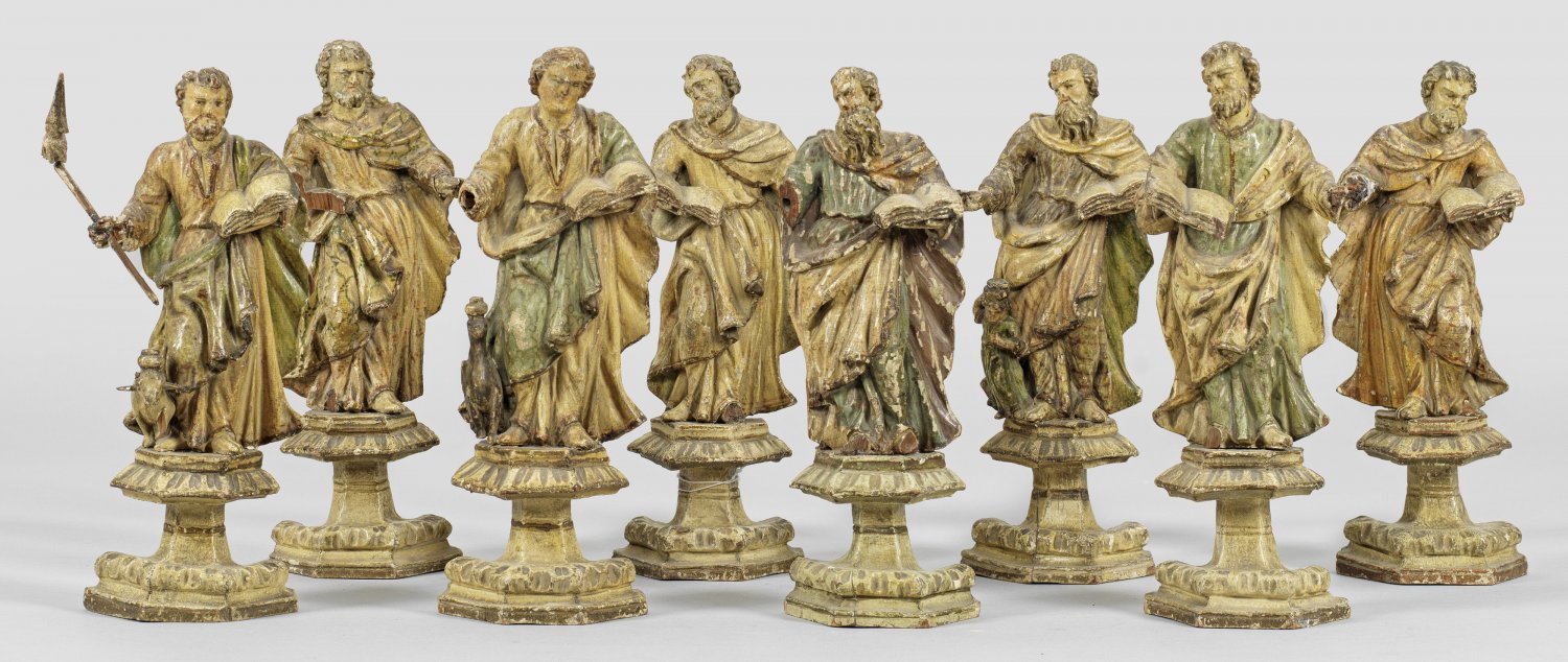 Lindenholz, geschnitzt und farbig gefasst. Annähernd vollplastische Statuetten der Apostel, teilw. mit ihren Attributen, auf eckigen Postamentsockeln mit Schäften. Besch.; Ca. 24,5 cm-25,5 cm.