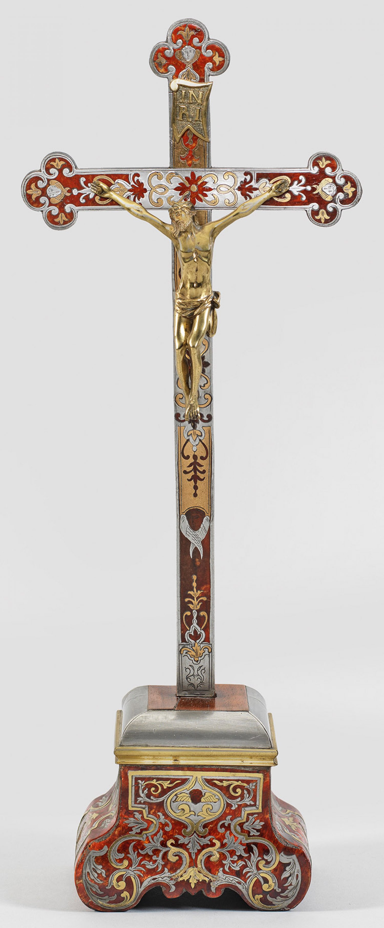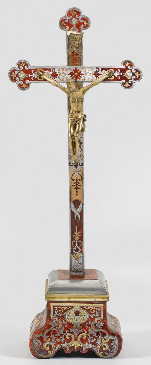 Barock-Standkruzifix mit Kreuz und Sockel in Boulle-Technik Dunkel gebeiztes Holz und Nussbaum, in Boulle-Technik gearbeitet mit Schildpatt, Messing- und Zinneinlagen; vollplastischer Corpus Christi im Dreinageltypus aus vergoldeter Bronze. Der geschweifte Sockel und das Kreuz dekoriert mit reichem Bandelwerk und Akanthusranken sowie Engelsköpfen, am oberen Kreuzende eine montierte Kartusche mit Inschrift "INRI". H. 56,5 cm.
