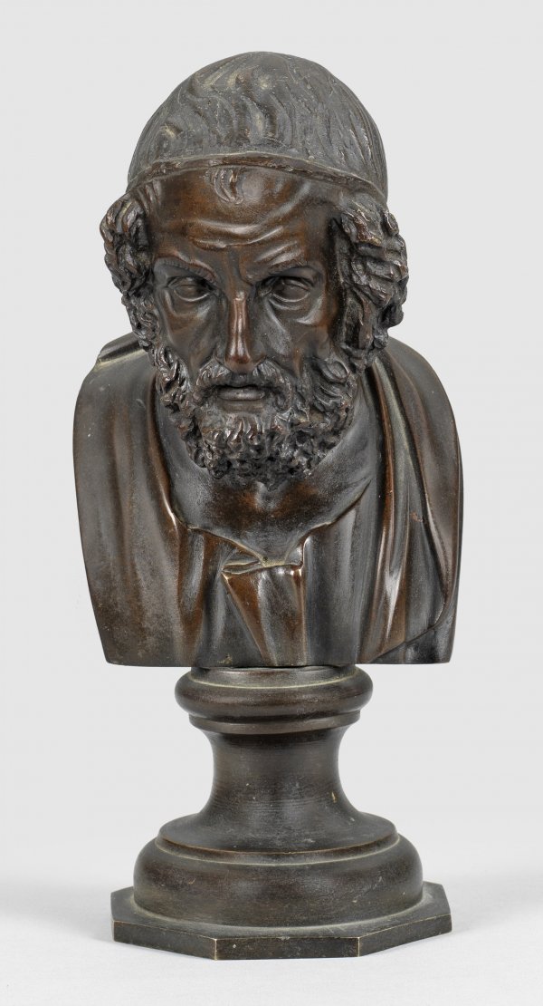 Bronze, dunkel patiniert. Auf eine runde, unterhalb achteckige Säulenplinthe komponierte, vollplastische Büste des bedeutenden griechischen Dichters Homer als blinder Greis, wohl nach einem hellenistischen Vorbild. H. 27 cm.