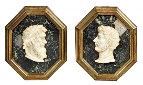 Gegenstücke. Reliefs aus weißem Carrara-Marmor. Hochachteckige Hintergrundtafel aus dunkelgrünem hell geädertem Marmor mit breiter profilierter Messing-Rahmung. Im Detail fein ausgeführte und subtil polierte von antiken Imperatorenporträts inspirierte Köpfe mit kurzem fein gelocktem Bart bzw. mit längerem Vollbart und Lorbeerkranz. 45 5 cm x 37 5 cm.