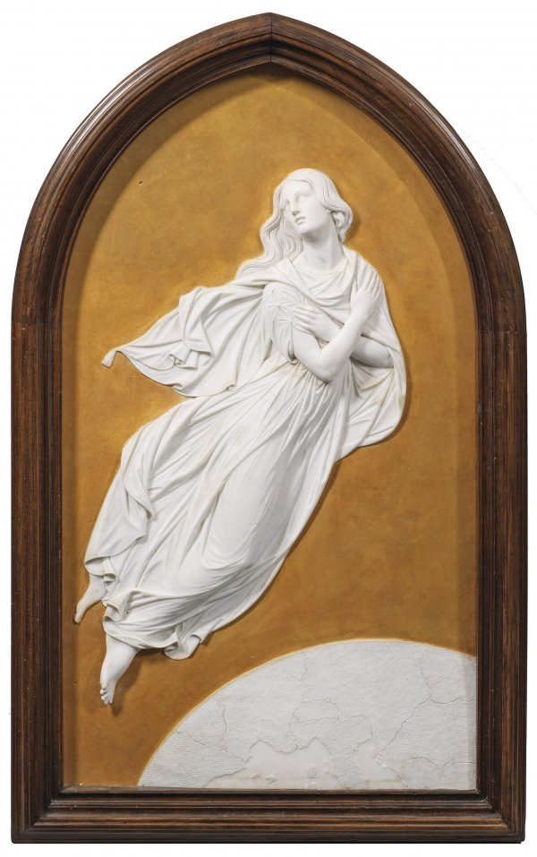 Weißer Carrara-Marmor, partiell vergoldet. Sign. "TROSCHEL" (von Rahmen verdeckt). Bildhauerisch meisterhaftes, überaus fein ausgeführtes, klassizistisches Relief des Bildhauers mit schwebender Figur über Europa. Troschel war ab 1821 Schüler von Christian Daniel Rauch in Berlin und stellte 1824 erstmals ein Theseusrelief aus. 1833 erhielt er für das Relief "Telemachos bittet Odysseus um das Leben des Sängers Pheimios" den großen Staatspreis für Skulptur verbunden mit einem Stipendium für einen Aufenthalt in Rom, wohin er 1834 reiste und dort zeitlebens ansässig blieb. Sein Oeuvre umfasst überwiegend Reliefs und Statuetten zu mythologischen und allegorischen Themen, außerdem einige Bildnisbüsten und -statuen (u. a. der Tänzerin Eißler, Lessings, Papst Pius IX. und König Friedrich Wilhelm IV. von Preußen) sowie Grabdenkmale. In Rom schmückte er den Palast des Herzogs Torlonia mit vierzehn Reliefs, welche die Taten des Kaisers Trajan darstellen. Reliefs und Skulpturen Troschels befinden sich heute u. a. in der Pinakothek in München. Alter Holzrahmen. H. 99,5 cm; B. 57 cm. Ges.-Maße (inkl. Rahmen) 111 cm x 70 cm x 9 cm.