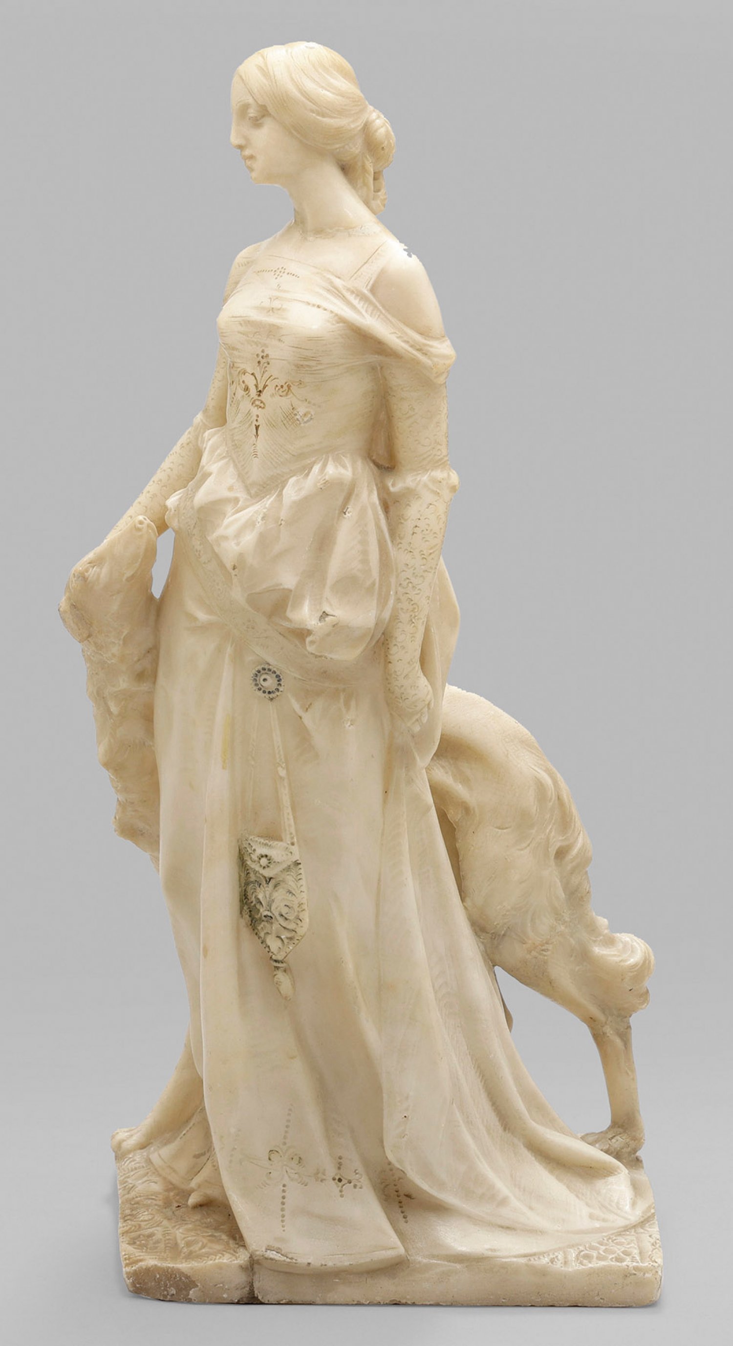 Alabaster, partiell gefasst. Vollplastische, im Detail fein ausgeführte Skulptur. Auf einer rechteckigen, als Teppich gestalteten Plinthe stehende, anmutige Dame (bzw. Braut) in einem weit auf den Boden herabreichenden, schulterfreien Kleid, mit langen Handschuhen und einer von einem Gürtel herabhängenden, kleinen Handtasche. Mit der rechten Hand streichelt sie liebevoll einen zu ihr aufschauenden, treuen Barsoi, dem vor allem in der russischen und später auch englischen Aristokratie geschätzten Begleit- und Jagdhund. Rest.; H. 45 cm.