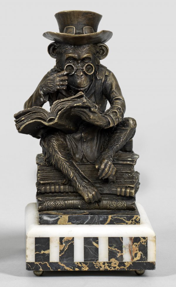 Bronze, dunkelbraun patiniert. Marmor- und Onyx-Sockel, Sign. "Pierre Mattieu"; Auf einem Bücherstapel sitzender Affe in neoviktorianischem Steampunk-Kostüm mit Zwicker, Zylinder und Schweißerbrille. Ges.-H. 24 cm.
