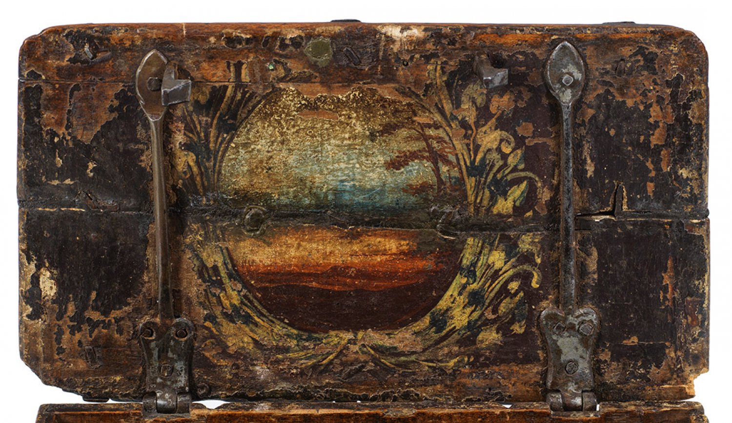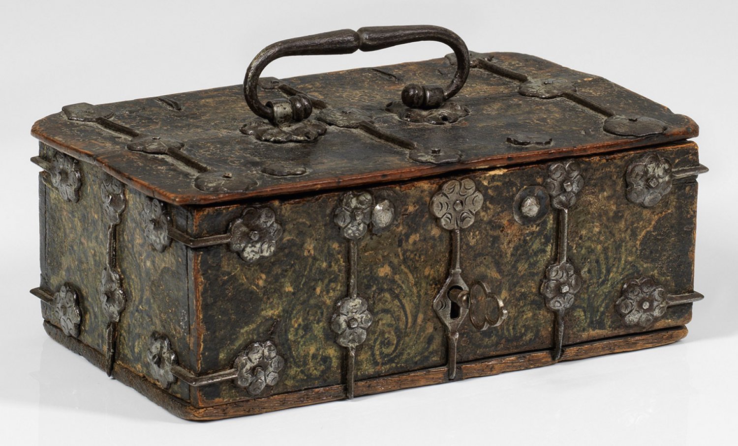 Seltenes Gotisches Minnekästchen Eiche mit geschmiedeten Eisenverbänden. Rechteckiger Korpus mit flachem scharniertem Deckel. Schmale (Eck-)Verbände mit blütenförmigen Abschlüssen aus geschmiedetem teilw. graviertem Eisen mit Resten von Verzinnung. Beweglicher Bandhenkel mit rosettenfömiger Montierung. Auf der Wandung und dem Deckel Restbemalung. Im Innendeckel zentrale von Akanthusblättern gerahmte Kartusche mit Landschaftsdarstellung. Innen originales Schloss mit zwei Zuhaltungen. Altersgemäßer unw. besch. Zustand. H. 8 cm. 21 cm x 12 cm.
