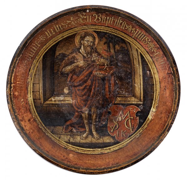 Seltene Hochzeitsschale Lindenholz, gedrechselt. Über kurzem Standring sich erweiternder, ausschwingender Korpus mit mittig verstärktem Rand. Im Spiegel großformatige Darstellung von Johannes dem Täufer vor einem tiefen Fenster mit weitem Landschaftsausschnitt. Bekleidet mit einem Gewand aus Kamelhaar und rotem Umhang. Mit seiner rechten Hand auf das Lamm Gottes und ein Buch in seiner linken Hand weisend. Am rechten Bildrand monogr. Wappenkartusche, dat. 1578. Umlaufend Bez.; Polychrome Malerei. Altersgemäße Gebrauchsspuren. D. 38 cm.