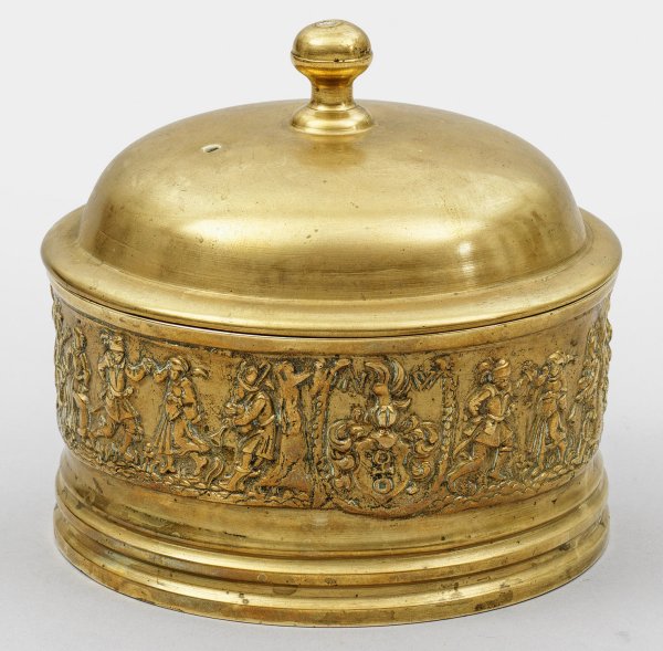 Züricher "Spanischsuppenschüssel" Messing, gegossen. Runder, zylindrischer Korpus über breitem, profiliertem Stand. Glockenförmig aufgewölbter Deckel mit gedrücktem Kugelknauf. Auf der Wandung umlaufender, breiter Relieffries mit szenischer Darstellung eines Bauerntanzes mit Paaren und Musikanten im Wechsel mit Wappen der Obwaldener Familie Wirz, monogr. "NW" für Niklaus Wirz (erstmals erwähnt 1528). Deckel mit Dampfloch. H. 14,5 cm. D. 15,5 cm.