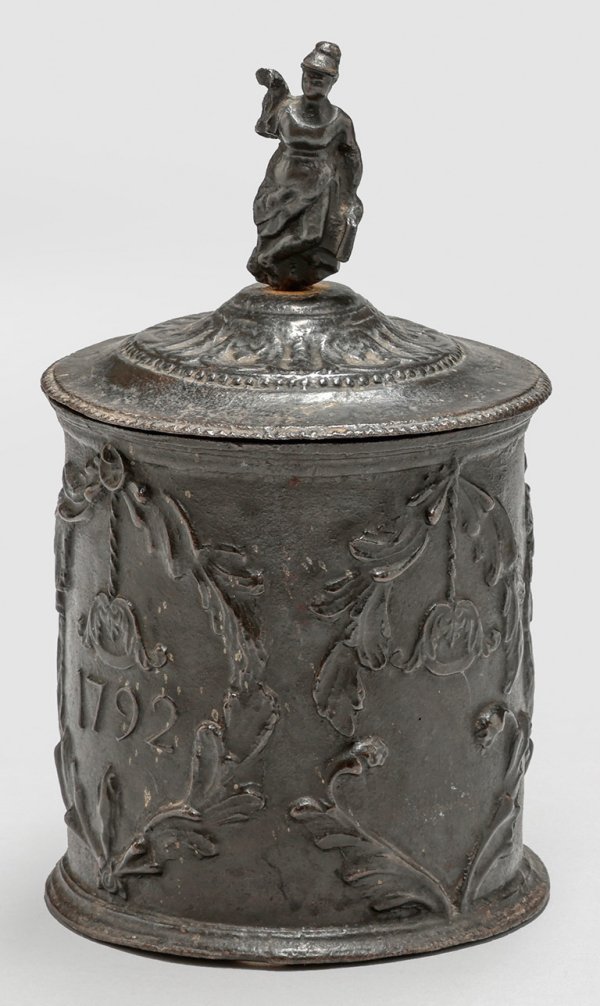 Tabaktopf Gusseisen. Über leicht ausgestelltem Stand zylindrischer Korpus umlaufend mit Ranken und Voluten verziert. Schauseitig das Datum 1792. Der Deckel mit Perlfries und Rocaillen verziert und zur Mitte hin leicht gewölbt. Als Handhabe eine vollplastisch gearbeitete Frauengestalt mit einem Buch in der Hand. Innen eine eingesetzte Platte mit Griff zum Beschweren. Auf der Deckelinnenseite unidentifizierbarer Gießereistempel. Altersbedingte Gebrauchsspuren. H. 23 cm. D. 13 cm.