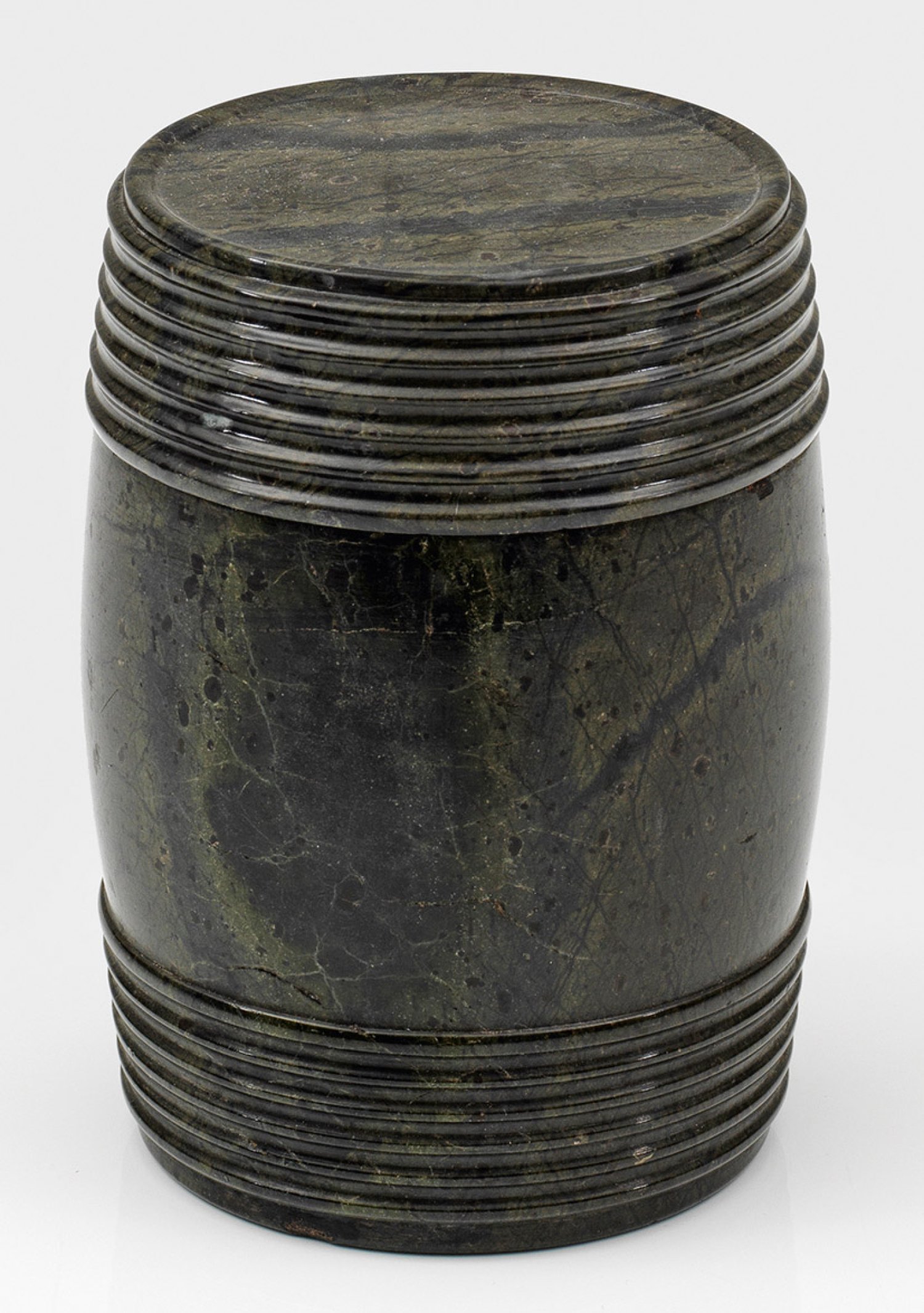 Serpentin-Schraubflasche Schwarz gemaserter dunkelgrüner Zöblitzer Serpentin. Fassförmiger an den Rändern profilierter Korpus mit Schraubdeckel. Innen flacher Deckel mit kurzem Knauf. H. 14 cm.